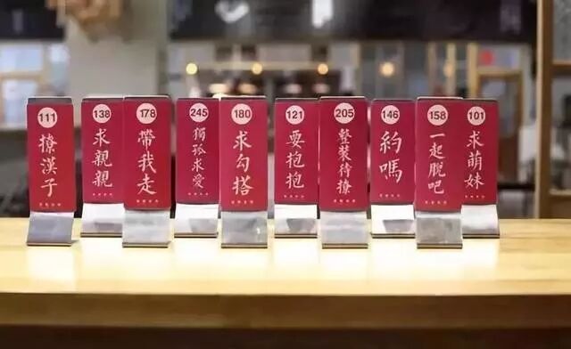 上海的桃园眷村餐厅将叫号牌变成了“脱单桌卡”,一共有10种脱单开场白供顾客选择。简单的桌卡结合当下大众心理,瞬间妙趣横生,在博得顾客会心一笑的同时,桃园眷村为自己的品牌增添了更生动的价值。