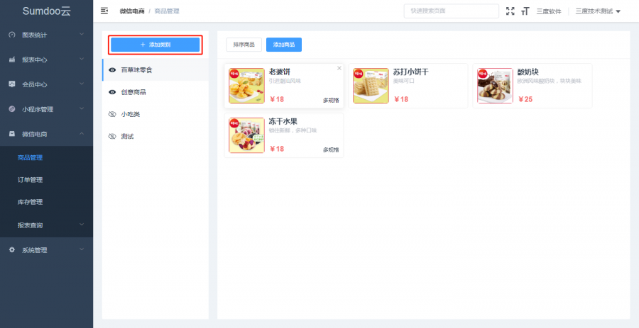 当商城中上架的产品较多时,可以进行商品分类,方便快速查找及管理。