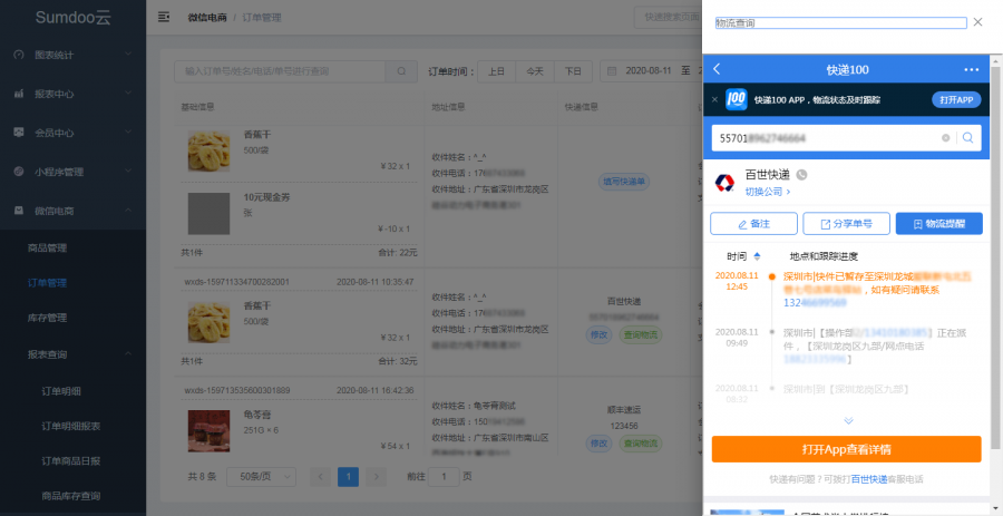 订单管理是电商平台必备的功能,可以快速搜索订单、查看订单状态,同时也可以在订单明细里填入快递单号、一键获取物流状态,功能方便又全面。