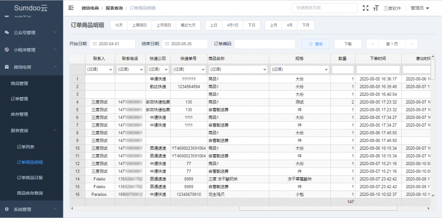 在电商管理平台中,也包含了报表查询的功能,可查询订单明细、商品日报等,方便财务人员查询及对账。